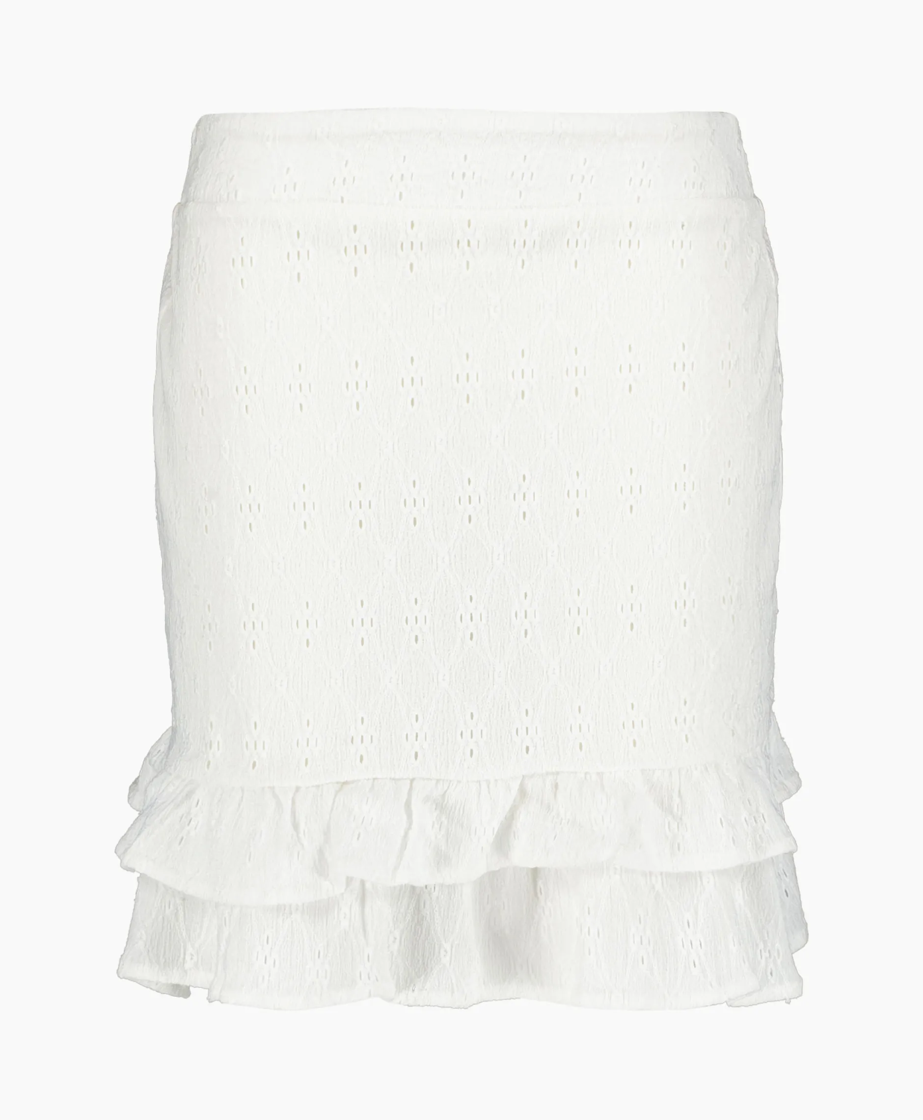 Minirok Gemaakt Van Een Soepel Vallende Broderie Stof. Ontworpen Met Volant Details Aan De Onderkant. Elastische Tailleband Aan De Binnenkant Van De Rug Voor Een Comfortabele Pasvorm. Materiaal: 96% Polyester En 4% Elastaan
