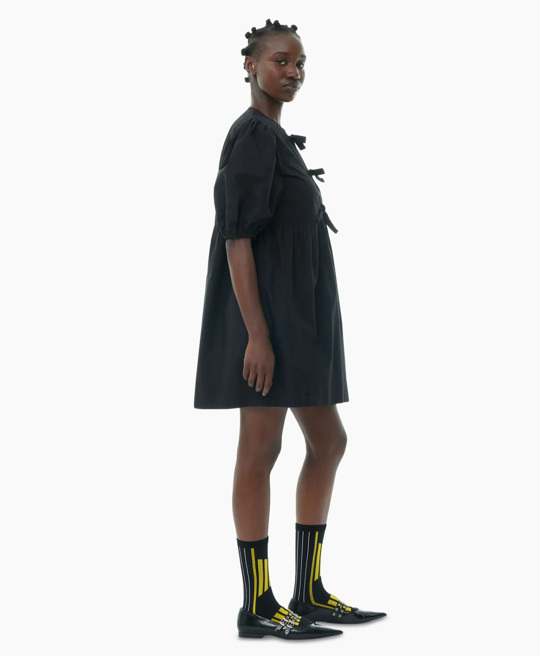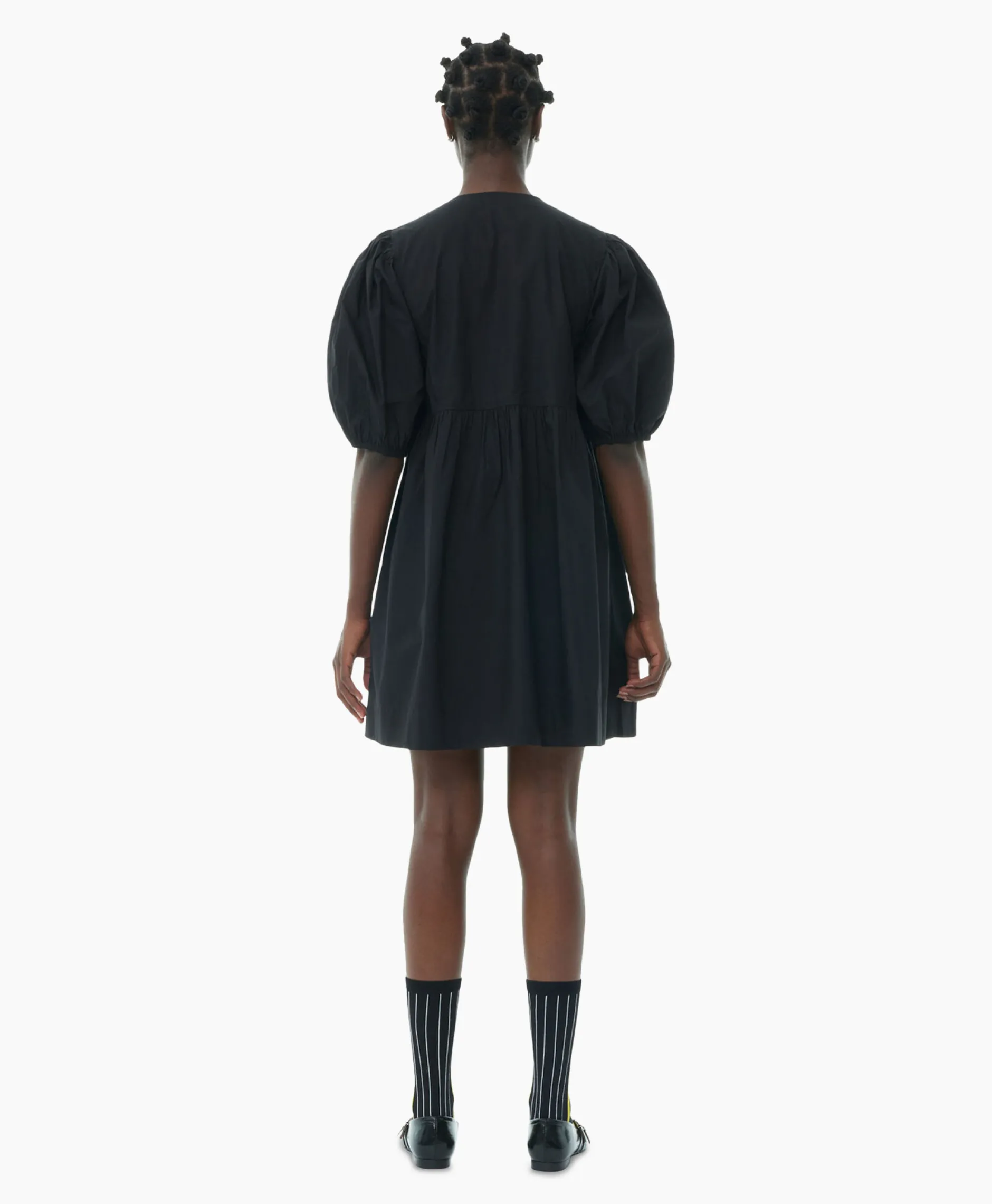 Deze Zwarte Katoenen Poplin Mini-Jurk Met Strikkoord Is Ontworpen Voor Een Relaxte Pasvorm En Heeft Een Open Ronde Halslijn Met Striksluitingen En Kenmerkende Pofmouwen Met Elastische Randen.&Nbsp;