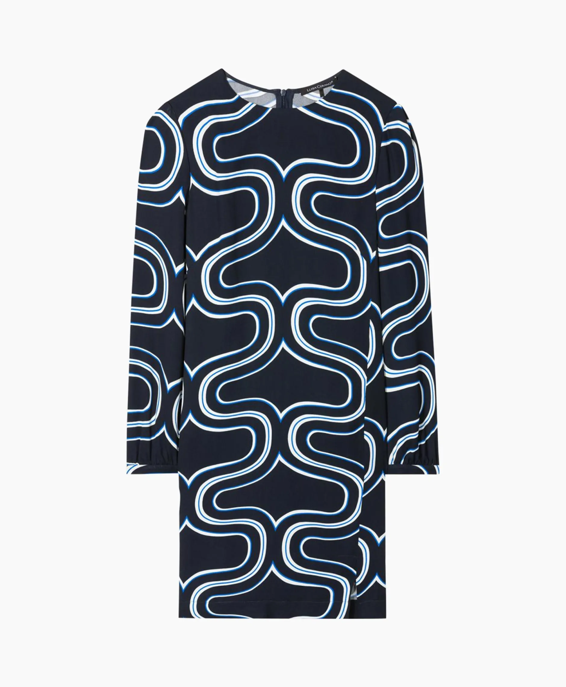 Mini-Jurk Van Ondoorzichtige Viscose-Crêpe Met Een Exclusief, Grafisch Geïnspireerd Dessin En Een Ronde Halslijn. De Soepelvallende Jurk Heeft Twee Zakken En Een Ritssluiting Aan De Achterkant. Ons Model Is 178 Cm Lang En Draagt Maat 36. Materiaal: 100% Viscose.