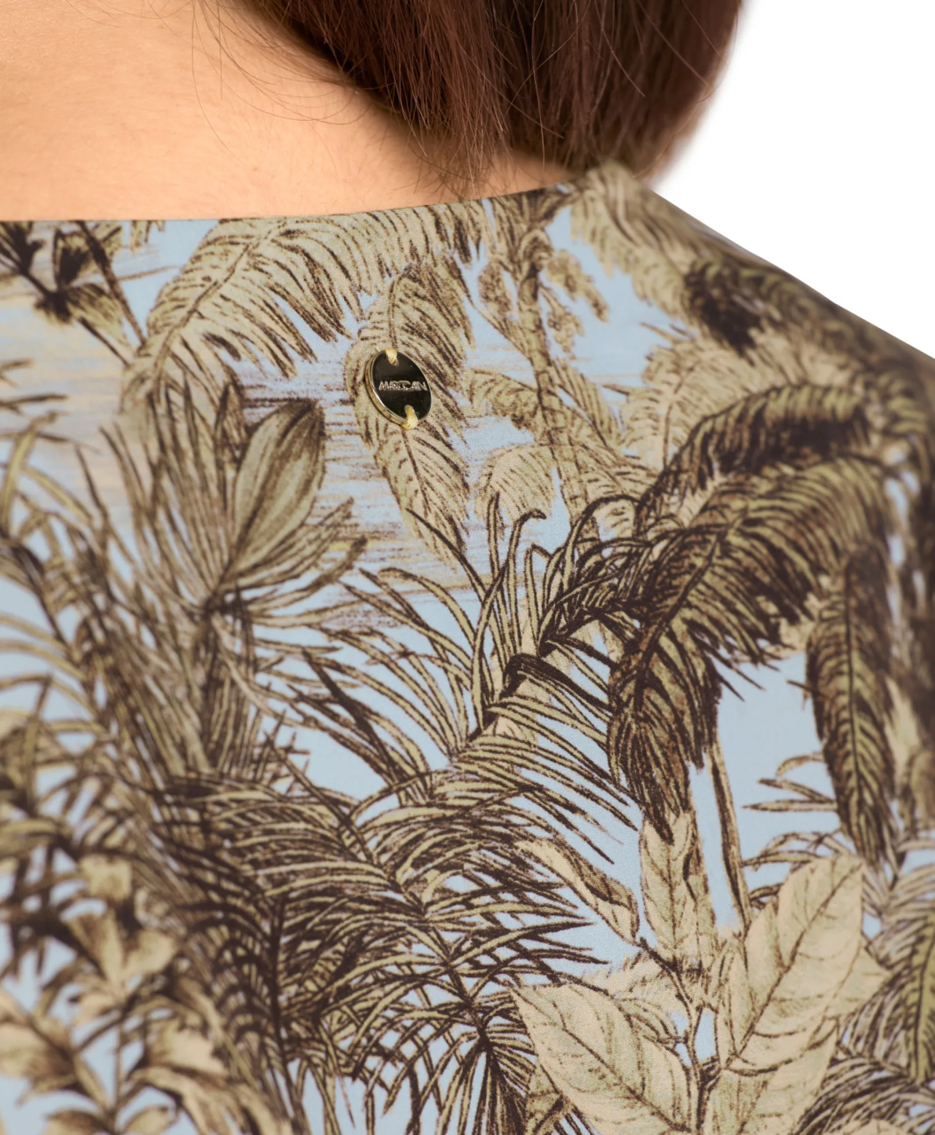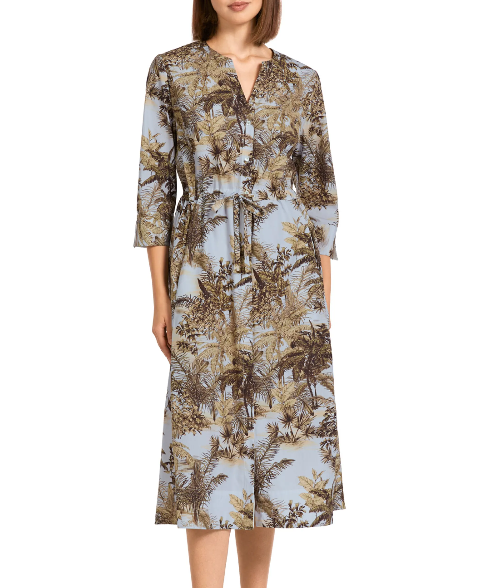 Maak Een Statement Met Deze Kleurrijke Jurk Van Marccain. Gemaakt Van 100% Duurzaam Katoen. Het Licht Gedrapeerde Materiaal Vloeit In Een Wijd A-Lijn Silhouet, Die Elk Figuur Flatteert. Het Speelse Blauw-Beige Palmpatroon, Verrijkt Met Verfijnde Smokwerkdetails Rond De Middel, Maakt Deze Jurk Een Echte Eyecatcher!De 3/4 Lengte Mouwen En De Zijdelingse Splitjes Zorgen Voor Extra Stijl En Bewegingsvrijheid. De Taille Is Voorzien Van Een Trekkoord Voor Een Perfecte Pasvorm. Met Een Normale Pasvorm Past Hij Perfect Bij Elke Gelegenheid.Ons Model Is 179 Cm En Draagt Maar N3/38. Het Onderhoud Is Eenvoudig: Was Hem Op 30 Graden Op Een Fijnwasprogramma En Strijk Voorzichtig, Zonder Te Veel Hitte Of Stoom. Voeg Deze Unieke Jurk Met Palmprint Toe Aan Je Garderobe En Geniet Van Comfort En Stijl In Één.
