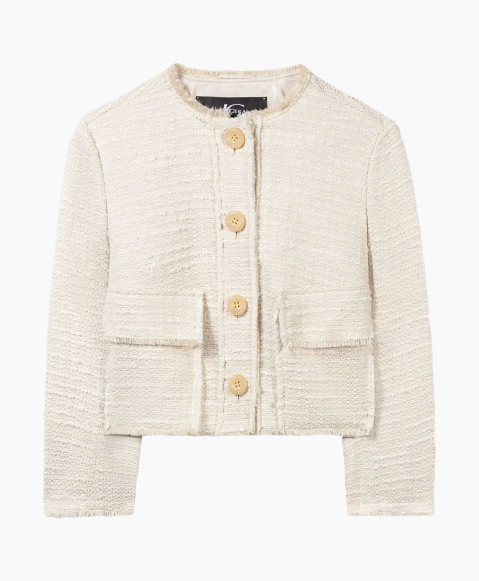 Elegant Jasje In Cropped Model Met ¾-Mouwen. Dit Gevoerde Jasje Is Gemaakt Van Zacht Katoenen Tweed En Is Afgewerkt Met Decoratieve Klepzakken En Moderne, Grote Knopen.Ons Model Is 178 Cm Lang En Draagt Maat 36.&Nbsp;
