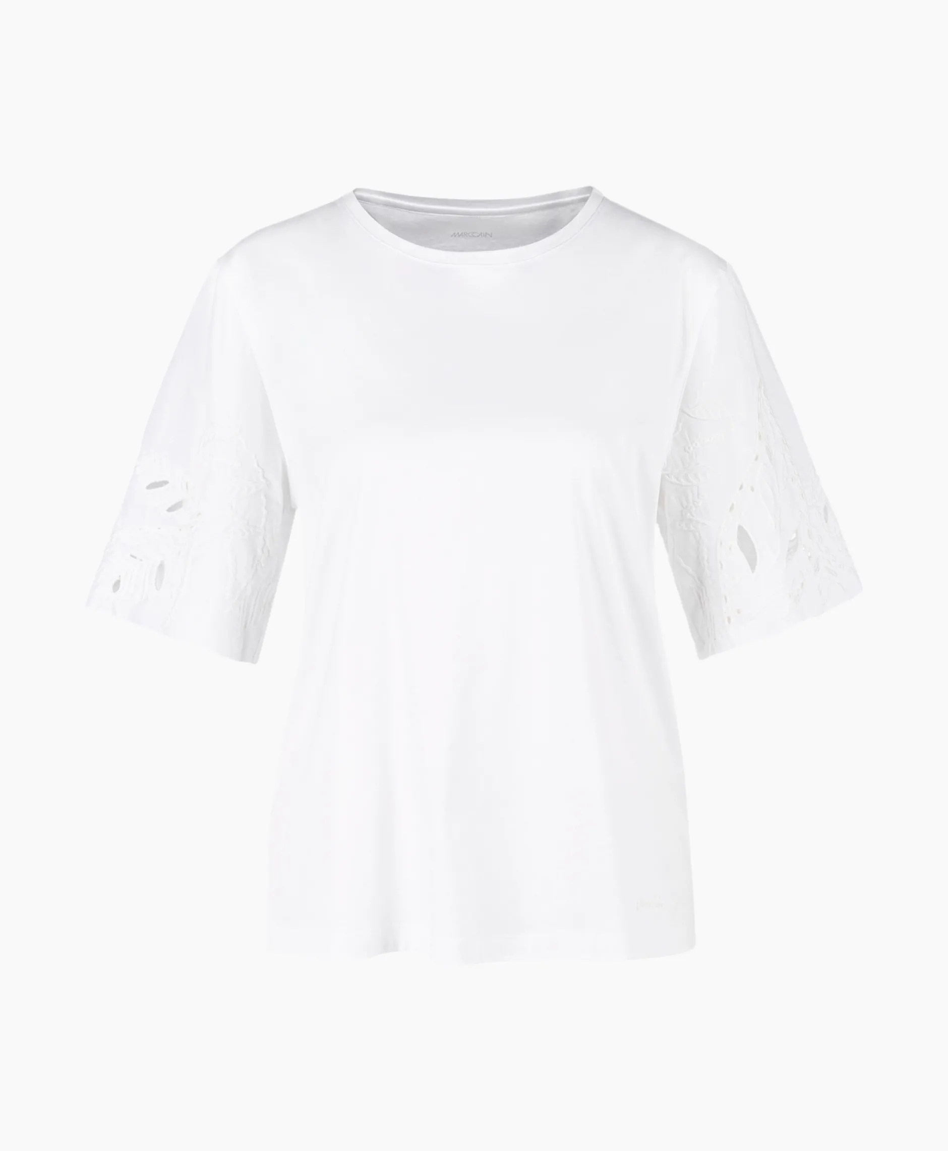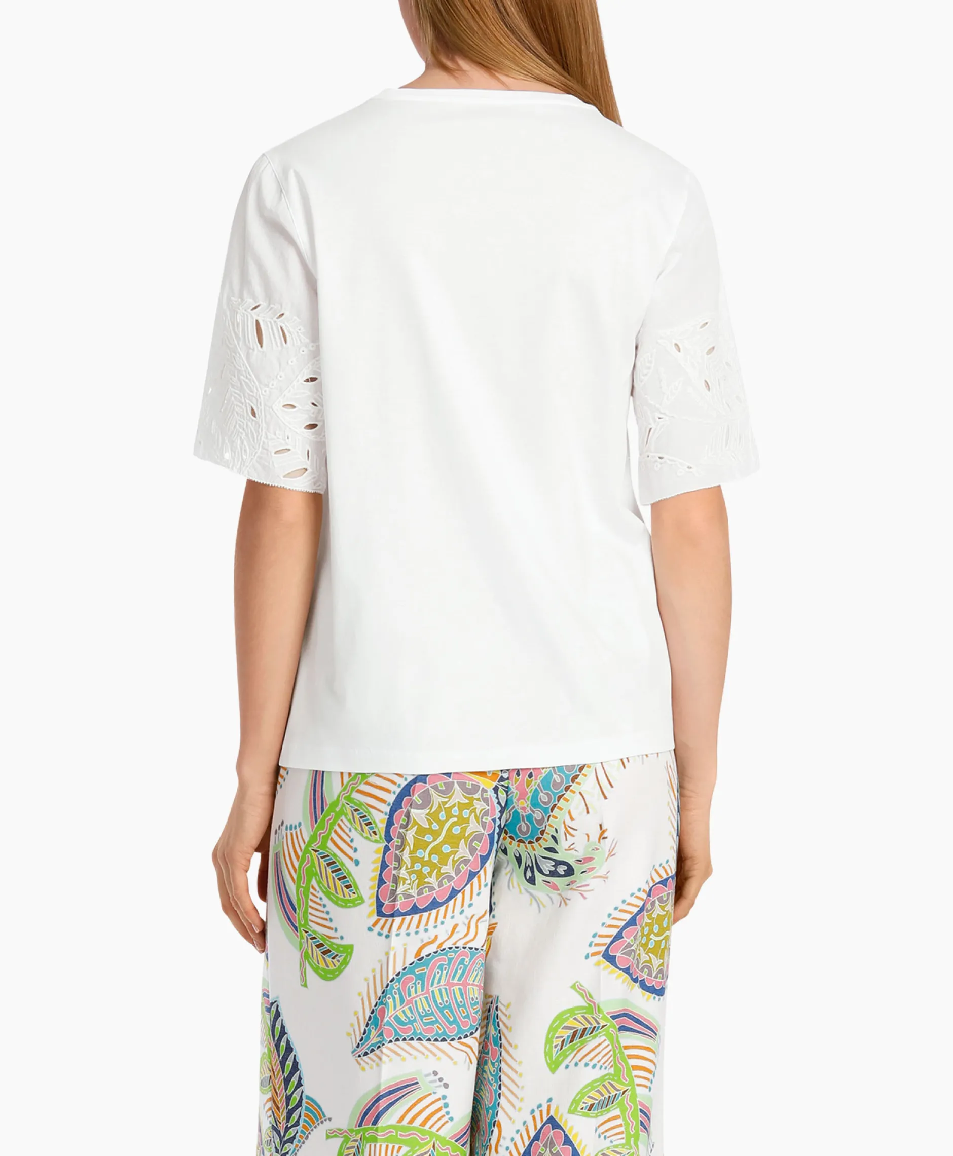 T-Shirt In Een Materialenmix. Het Model Is Recht Gesneden En Heeft Een Ronde Hals. Voor- En Rugpand Zijn Van Katoenjersey. De Mouwen Zijn Van Katoenweefsel. Ze Zijn Versierd Met Een Fancy Bladmotief In Engels Borduurwerk. Een Romantische Twist, Die Het T-Shirt Tot Een Perfecte Must-Have Voor De Feestelijke Zomergarderobe Maakt.Het Model Is 179 Cm Lang En Draagt Maat N3 / 38.&Nbsp;