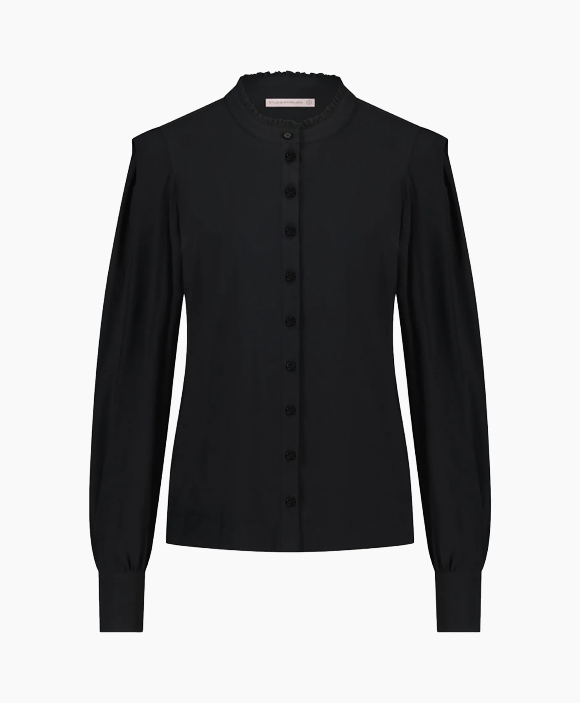 De Nellie Blouse Van Studio Anneloes Is Een Tijdloze Musthave. Deze Elegante Zwarte Blouse Heeft Een Comfortabele Fit En Biedt De Perfecte Balans Tussen Stijl En Functionaliteit. De Sierlijke Ruches Geven De Blouse Een Chique Touch. Stofsamenstelling: 73% Polyamide, 27% Elastaan.